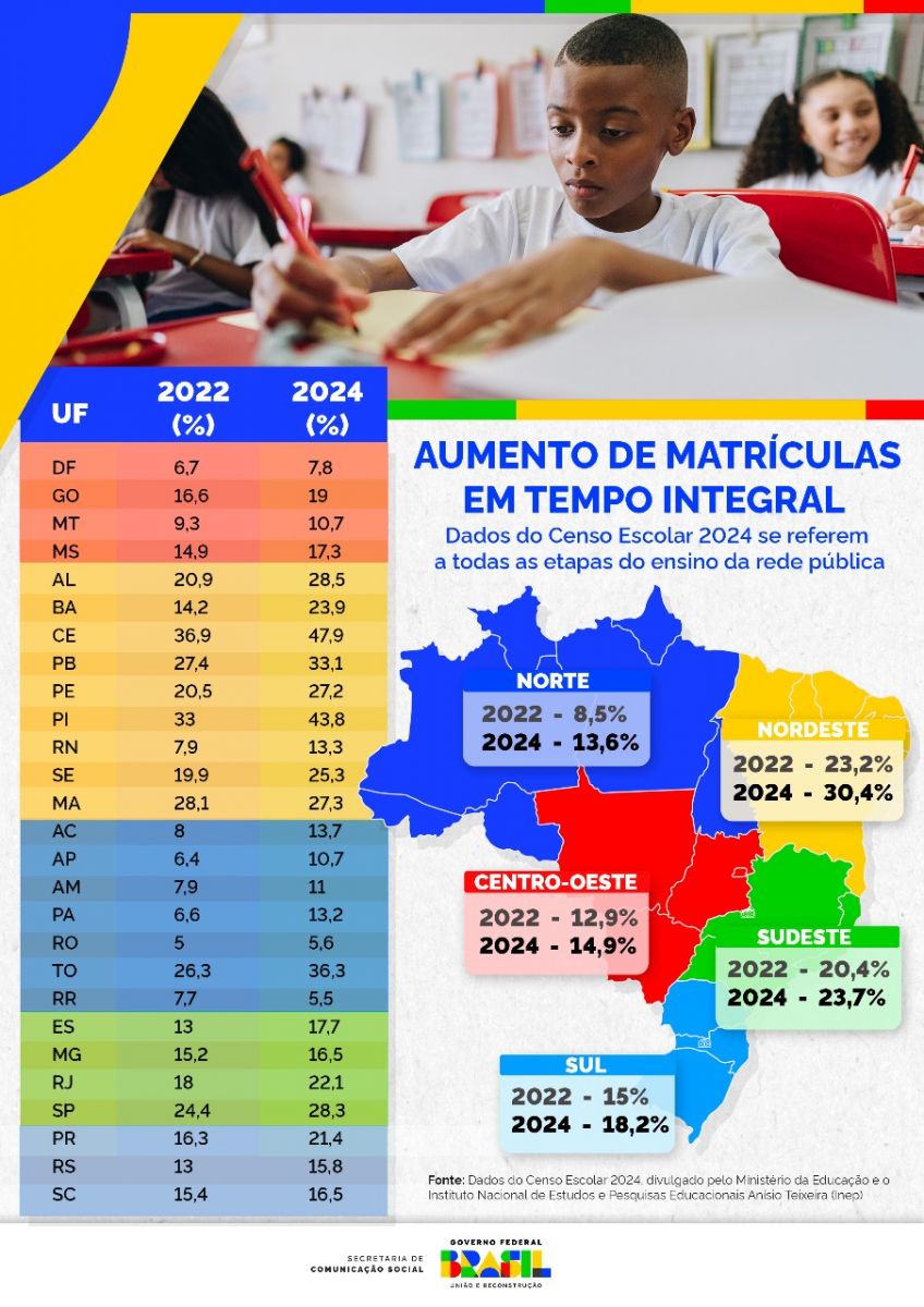 Em todo o país, entre 2022 e 2024, o percentual de dupla jornada nas creches passou de 56,8% para 59,7%. Na pré-escola, o avanço foi de 12,1% para 15,6% e, no ensino fundamental, de 14,4% em 2022 para 19,1% em 2024. O percentual do ensino médio saiu de 20,4% matrículas em 2022 para 24,2% em 2024. Considerando todas as etapas, o aumento foi de 18,2% em 2022 para 22,9% em 2024.