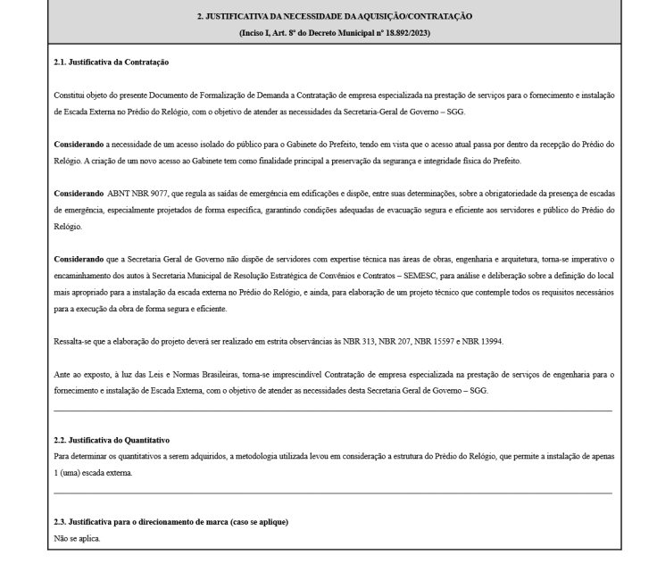 O documento fala que uma das justificativas para a obra é a segurança para garantir a integridade física do prefeito, pois, para ele entrar no local tem que passar pela recepção. Outra alegação é de que o edifício não possui saídas de emergências, que são obrigatórias para garantir a evacuação segura e eficiente dos servidores em caso de urgência.