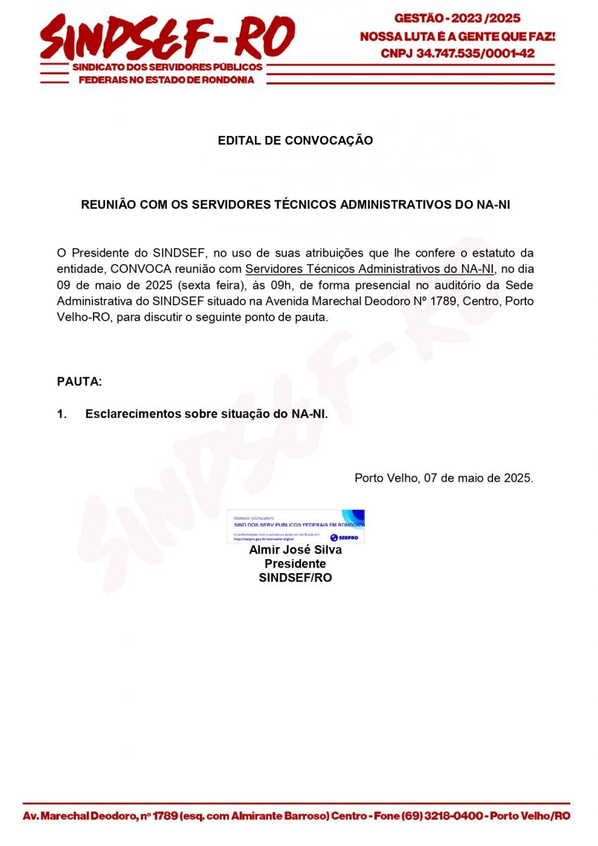 O Sindsef convoca todos os seus filiados que aguardam informações sobre o NA/NI (mudança de nível auxiliar para nível intermediário) para participarem de reunião nesta quinta-feira, dia 8 de maio, às 9h, no auditório da Sede Administrativa, localizada na Rua Marechal Deodoro, 1789 – Centro.