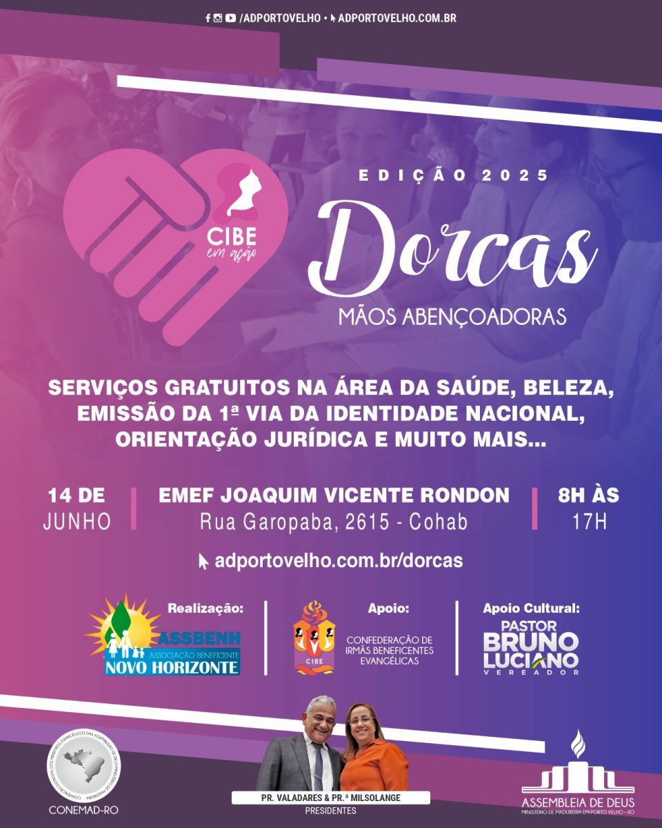 A Confederação de Irmãs Beneficentes Evangélicas de Porto Velho - CIBE, departamento que integra a Assembleia de Deus Ministério de Madureira, em parceria com a Associação Beneficente Novo Horizonte - ASSBENH, realizará no próximo dia 14 de junho (sábado) a partir das 8h nas dependências da Escola Municipal Joaquim Vicente Rondon – Zona Sul da capital, a 8ª edição da Ação Social Dorcas – Mãos Abençoadoras, com serviços em diversas áreas para toda a comunidade em geral.