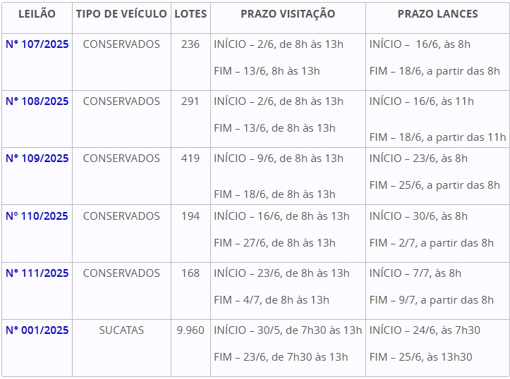 Os editais onde constam todas as informações sobre os veículos disponíveis estão publicados no portal oficial do