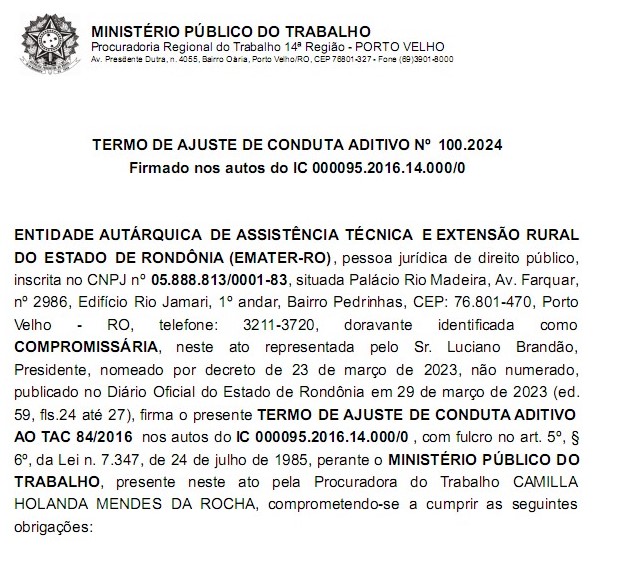 Tanto que a partir dessa prática recorrente, o Ministério Público do Trabalho (MPT) negociou com a Emater um termo aditivo (TAC nº 100/2024), que estabelece 30 obrigações — incluindo a instauração de programa de compliance — com o objetivo de coibir assédio moral e eleitoral na autarquia. Luciano assinou o documento com a procuradora do Trabalho, Camilla Holanda Mendes da Rocha, de forma eletrônica.
