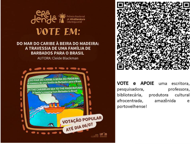A escritora rondoniense Cleide Blackman está na disputa pelo Prêmio Nacional de Afroliteratura Infantojuvenil Erê Dendê, com o livro infantojuvenil intitulado ‘Do mar do Caribe à beira do Madeira: a travessia de uma família de Barbados para o Brasil’. A votação está aberta e vai até o dia 06 de julho de 2025. Cleide está entre as finalistas com chances de trazer essa premiação para Rondônia, vamos participar votando no
