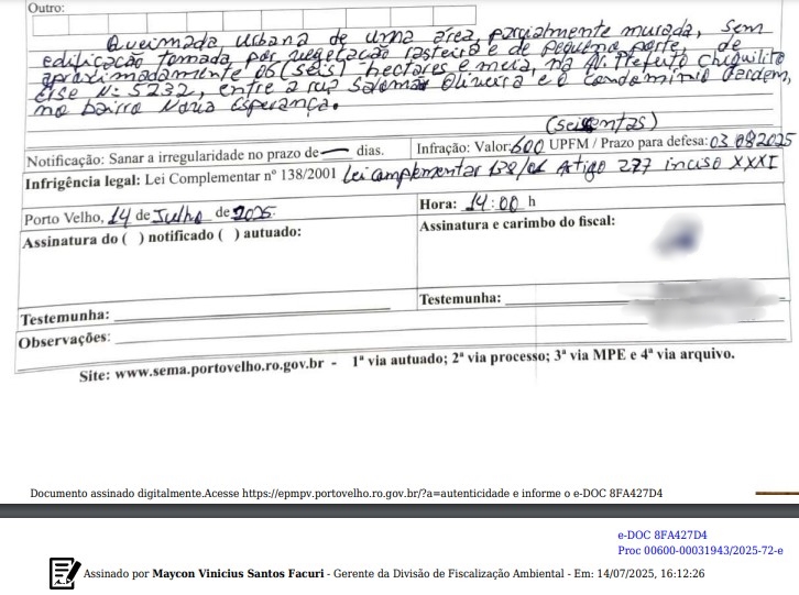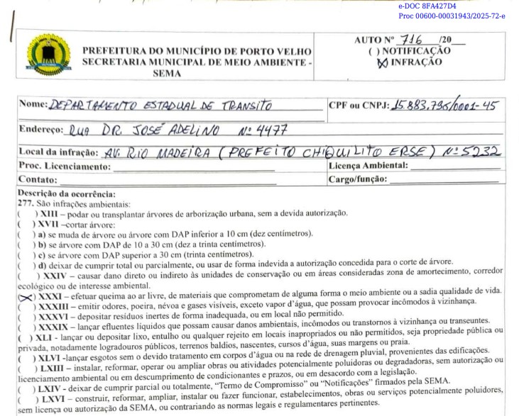 A fiscalização ambiental da Secretaria Municipal de Meio Ambiente (Sema) emitiu auto de infração contra o Departamento Estadual de Trânsito (Detran) por queimada urbana em um terreno localizado na avenida Rio Madeira, nº 4477, onde seria construída a sede estadual da autarquia de trânsito.