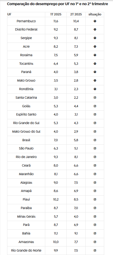 O IBGE detalhou nesta sexta-feira (15/8) desdobramentos estaduais da menor taxa de desemprego já registrada pelo país na série histórica desde 2012, de 5,8%, no segundo trimestre de 2025. Comparada aos primeiros três meses do ano, a desocupação apresentou redução em 18 das 27 Unidades da Federação e ficou estável nas outras nove, segundo dados da PNAD Contínua.