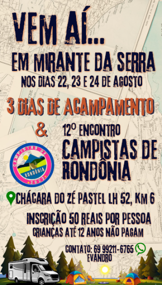 A cidade de Mirante da Serra está sediando desde a última sexta-feira (22), o 12º Encontro Campista de Rondônia, na chácara do Zé Pastel, na linha 52, Km 6. O Clube Campista de Rondônia existe desde 2012 e esse encontro, segundo os organizadores, é um momento de trocar experiências para todos os que gostam dessa prática em Rondônia. Mais informações podem ser obtidas pelo telefone 69 9 9211 6765 (Evandro). Uma boa pedida!