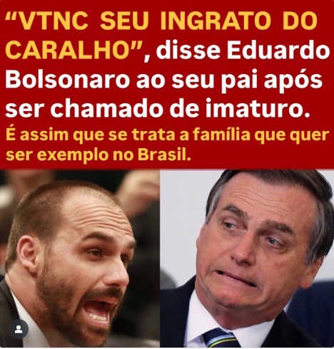 Por falar em capotar, quem teve acesso aos diálogos entre o deputado Eduardo Bolsonaro, que está nos Estados Unidos conspirando contra a economia brasileira, e o pai, Jair Bolsonaro, ficou chocado. O filho em determinado trecho, não hesita em dizer: ‘VTNC! Seu ingrato do Ca......!”. Para quem pregava o Deus, Pátria e Família, essa conversa de pai e filho derruba tudo o que tentou se vender para o eleitorado nacional, de conservadorismo e respeito com os mais velhos, em especial, os pais. Nesse caso, tudo é um exemplo do que não se deve fazer entre pais e filhos. Máscaras caindo!