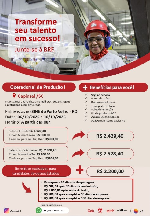 Segundo a empresa, há benefícios específicos para candidatos oriundos de Rondônia, o que reforça o compromisso da BRF em apoiar a relocação e integração dos novos colaboradores em suas unidades.
