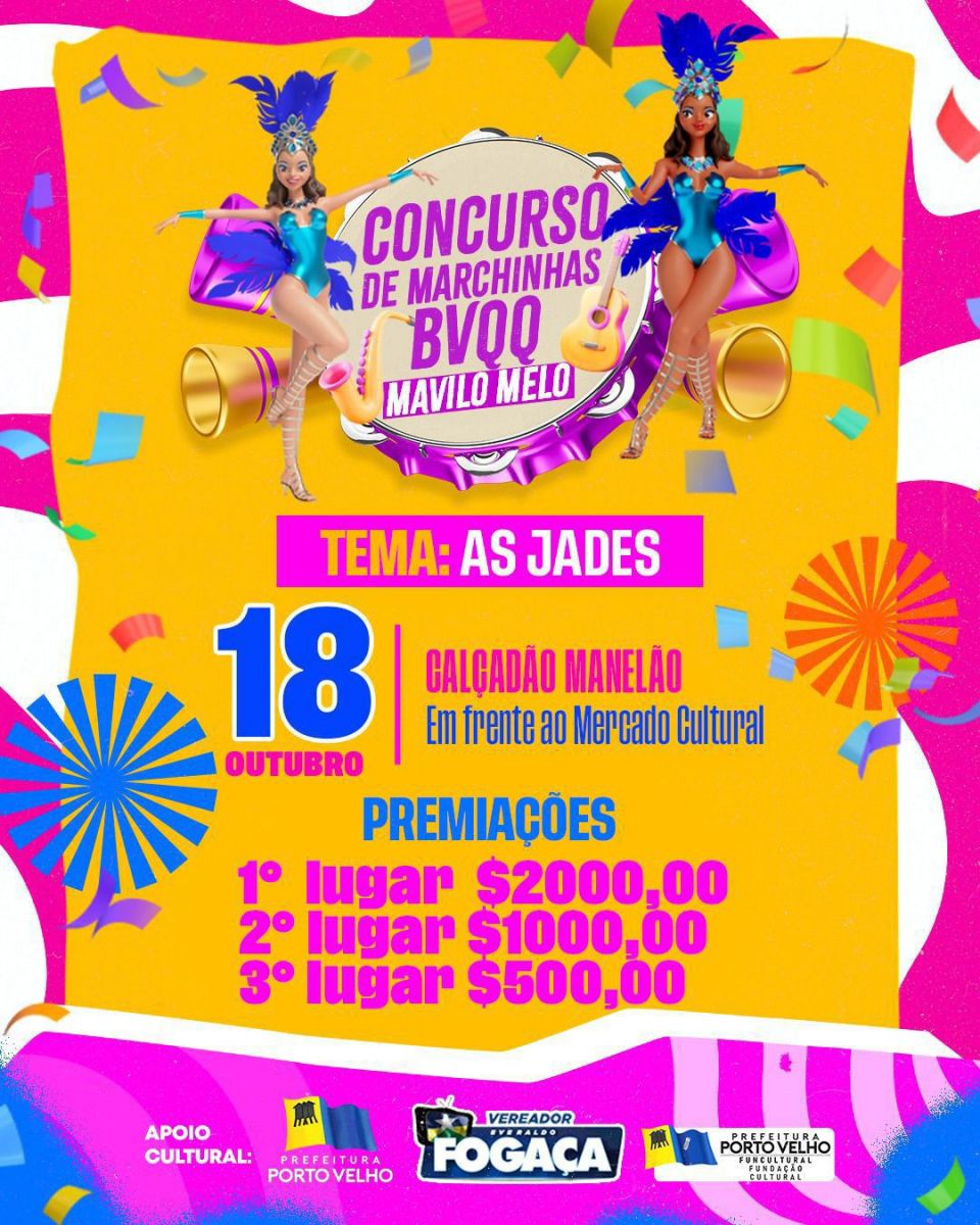 Neste sábado (18), às 19h no Calçadão Manelão no Mercado Cultural acontece o 1°Concurso de Marchinhas Mávilo Melo, com o tema: 'As Jades'. 'A idealização desse concurso é uma singela homenagem aos nossos compositores que são todos locais, e ainda uma forma de prestigiar aqueles que todos os anos se dedicam a compor as marchinhas da Banda', disse a presidente do bloco, Siça Andrade.