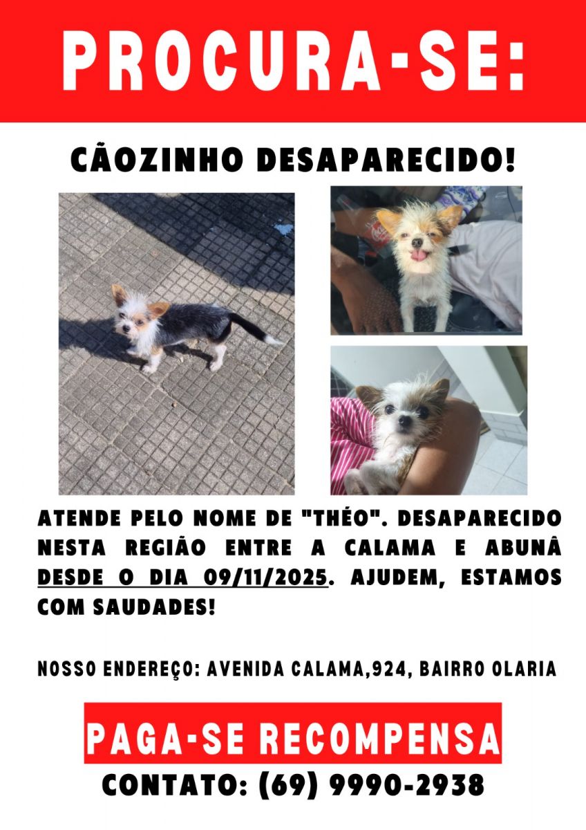 O cachorrinho, Theodoro Henrique, desapareceu no dia 09/11/2025, na Avenida Calama, em frente à Maple Bear, região central de Porto Velho.
