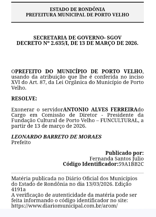 O prefeito de Léo Moraes (PODE) decidiu exonerar o presidente da Fundação Cultural de Porto Velho (Funcultural), Antônio Ferreira, conhecido popularmente como “Ferreirinha”.