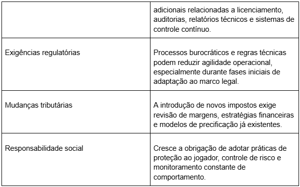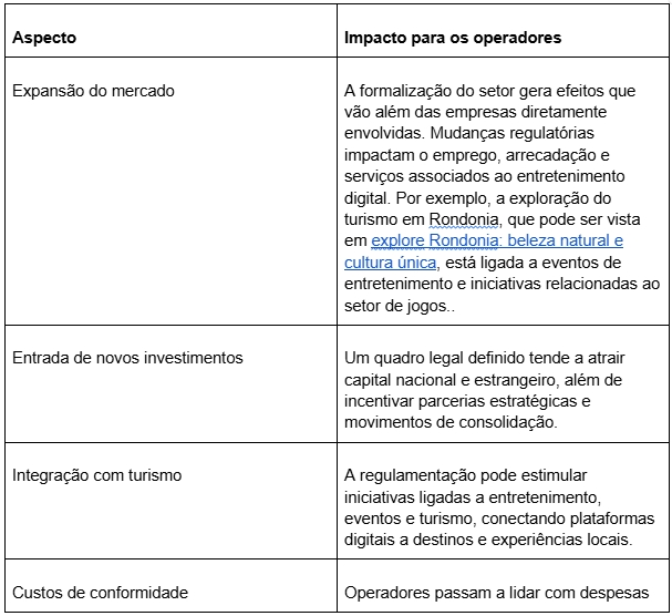 A criação de um ambiente regulado altera diretamente a forma como empresas do setor planejam suas operações. Com regras mais claras, surgem oportunidades de crescimento estruturado, mas também novas exigências legais e operacionais. Para operadores, o cenário passa a combinar potencial de expansão com necessidade de adaptação constante.