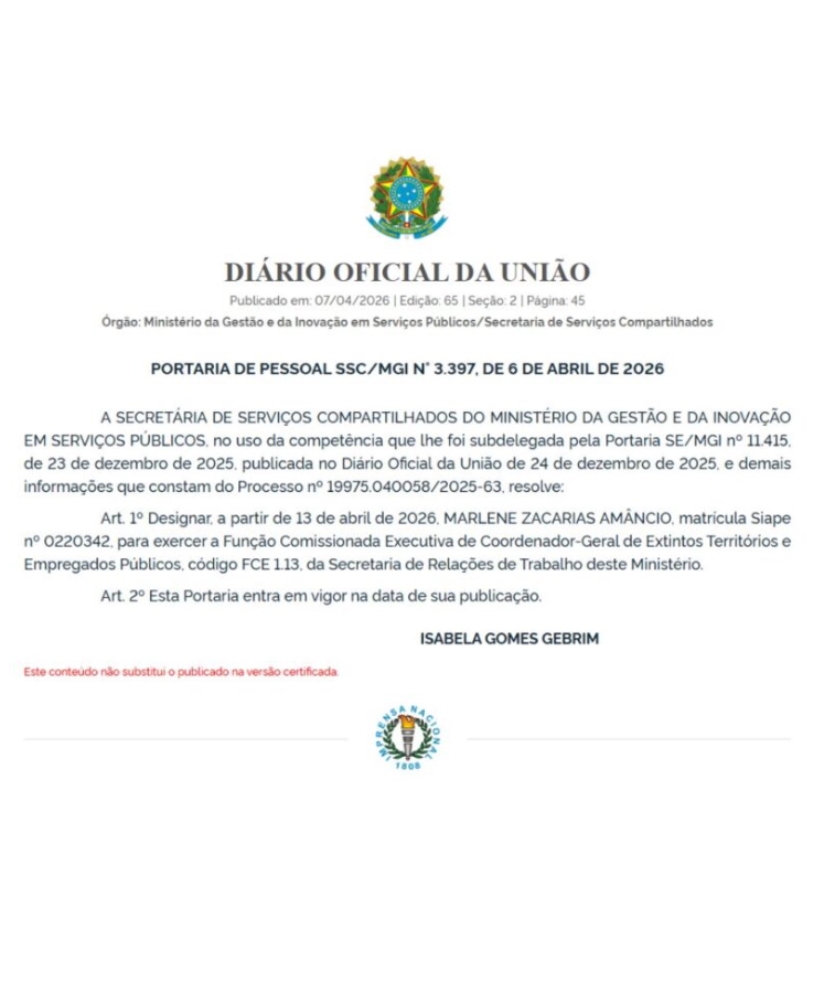 Entrou oficialmente em vigor nesta segunda-feira, dia 13 de abril, a Portaria n° 3.397, que formaliza a nomeação de Marlene Zacarias Amâncio para o cargo de Coordenadora-Geral de Extintos Territórios e Empregados Públicos. A decisão, assinada pela Secretaria de Serviços Compartilhados do Ministério da Gestão e da Inovação em Serviços Públicos (MGI), já havia sido publicada no Diário Oficial da União na semana anterior e agora marca o início de uma nova fase na gestão administrativa dos servidores.