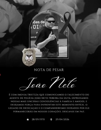 A Polícia Civil do Estado de Rondônia manifesta, com profundo pesar, o falecimento do servidor JOÃO NETO PEREIRA DA SILVA, nascido em 28 de setembro de 1970, ocorrido nesta data.