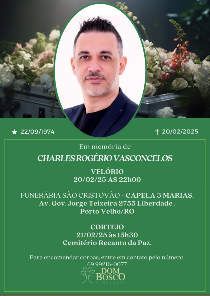 O velório do servidor público do Tribunal de Contas do Estado (TCE), Charles Vasconcelos, acontecerá nesta noite desta quinta-feira (20) na funerária São Cristóvão, localizada na Avenida Jorge Teixeira, bairro Liberdade, em Porto Velho (RO).