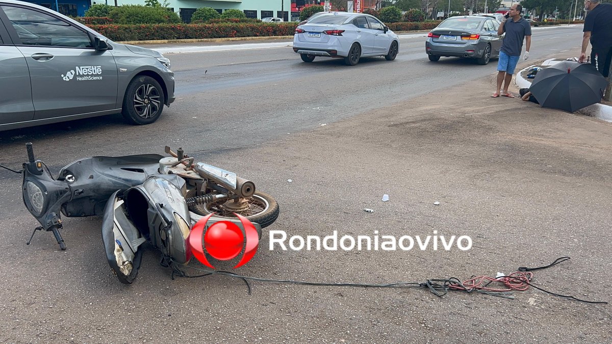No acidente, o passageiro do moto aplicativo ficou com uma grave fratura exposta na perna esquerda e caído no meio fio. O moto aplicativo e a condutora da outra motocicleta tiveram ferimentos leves.