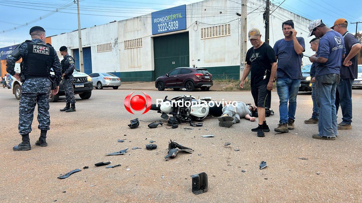 O condutor de uma motocicleta BMW ficou seriamente ferido após acidente ocorrido no início da noite desta segunda-feira (04) na Rua Pau Ferro com Monteiro Lobato, bairro Jardim Eldorado, zona Sul de Porto Velho (RO).