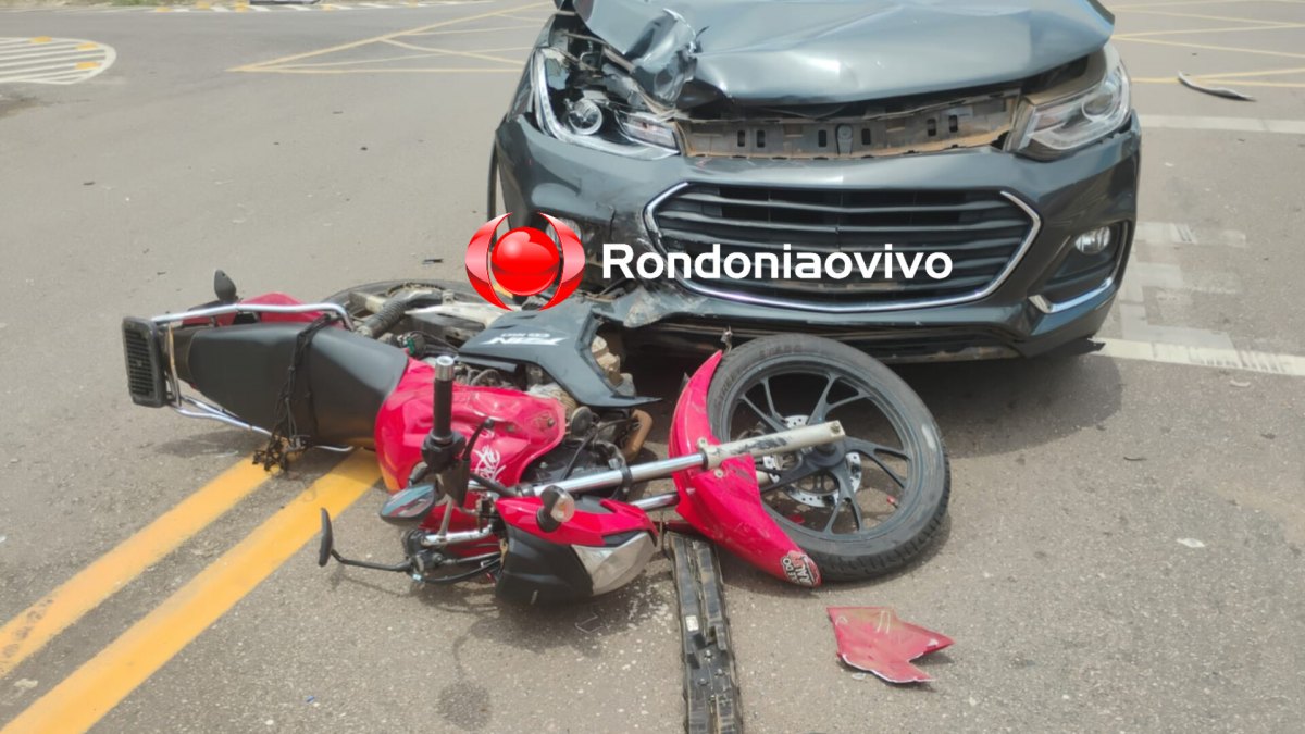O moto aplicativo seguia na Rua Afonso Pena, quando a motorista de um carro modelo Tracker avançou a preferencial e causou o acidente.