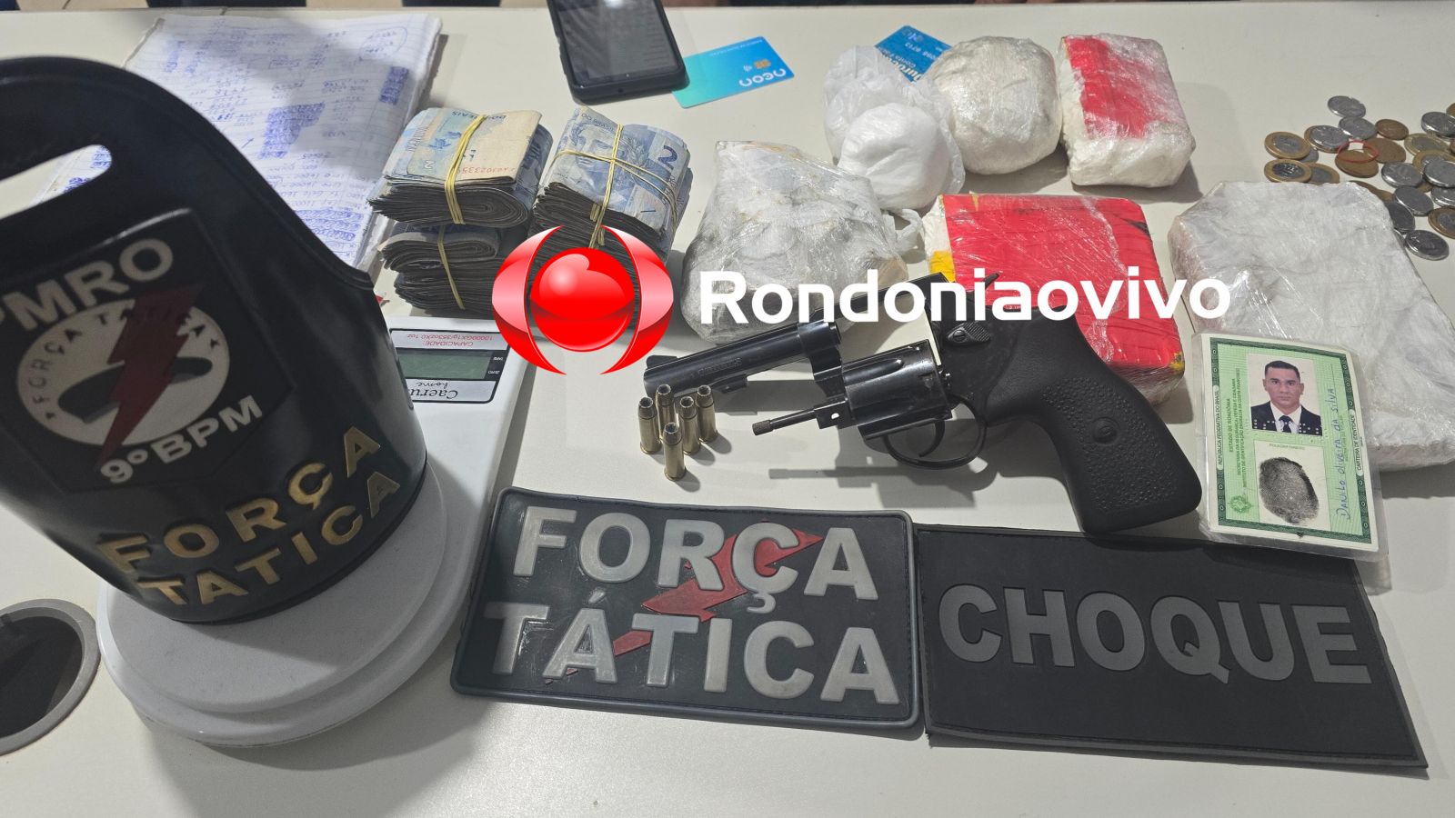 O acusado foi flagrado com um revólver, drogas, dinheiro, balança de precisão e documento falso. Contra o criminoso, existe mandado de prisão com condenação de 12 anos para cumprir.