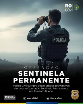 A Polícia Civil do Estado de Rondônia (PCRO), por meio da 1ª Delegacia de Polícia Civil de Pimenta Bueno, deflagrou, entre os dias 24 e 28 de novembro, a Operação SENTINELA PERMANENTE, destinada ao cumprimento de mandados judiciais de prisão preventiva expedidos em desfavor de cinco suspeitos envolvidos em crimes de roubo majorado e extorsão majorada no município.