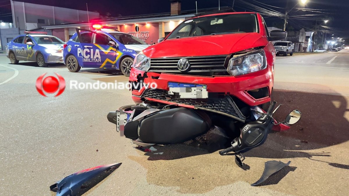 Uma moto Honda Biz foi parar embaixo de um carro modelo Gol e um casal ficou bastante ferido na noite desta quarta-feira (03) na Avenida Pinheiro Machado com Getúlio Vargas, bairro São Cristóvão, região Central de Porto Velho (RO).