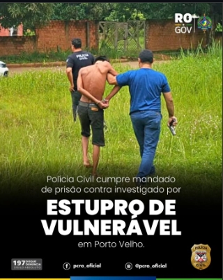Na data de hoje (30), a Polícia Civil do Estado de Rondônia, por meio da Delegacia Especializada na Proteção à Criança e ao Adolescente (DEPCA), deu cumprimento a mandado de prisão preventiva, expedido pela Vara de Crimes Contra Crianças e Adolescentes, em desfavor de um homem investigado pela prática do crime de estupro de vulnerável.