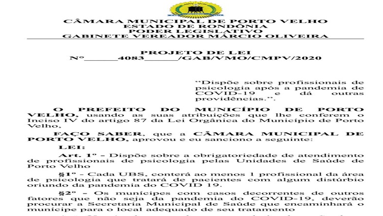Projeto de Lei do vereador Márcio Oliveira foi votado e aprovado na segunda-feira, 03, ele dispõe sobre a obrigatoriedade de atendimento de profissionais de psicologia pelas Unidades de Saúde de Porto Velho.