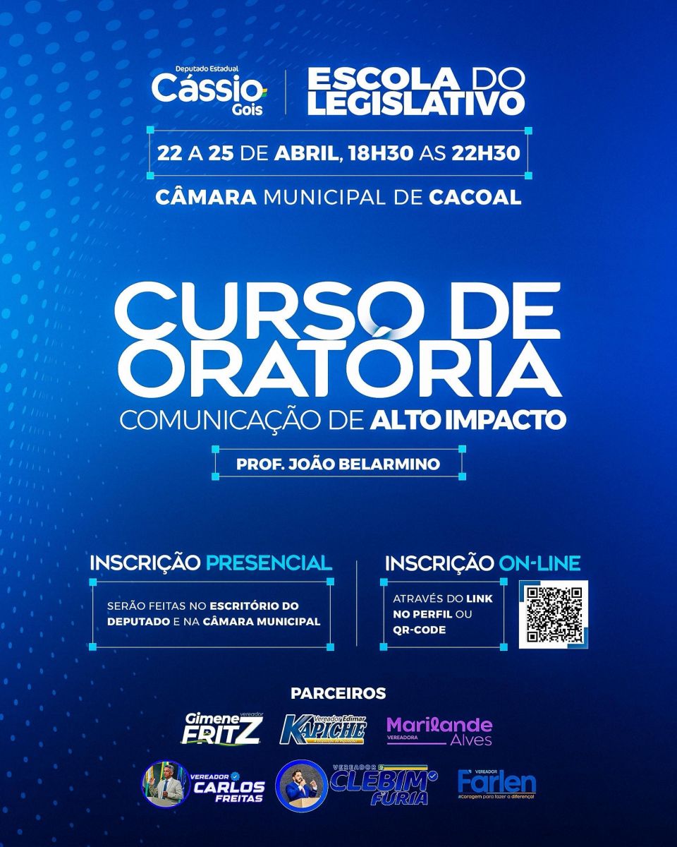 O deputado estadual Cássio Gois (PSD), em parceria com a Escola do Legislativo de Rondônia (ELERO), está promovendo em Cacoal o curso "Comunicação de Alto Impacto", voltado para o desenvolvimento de habilidades de oratória e comunicação eficaz.