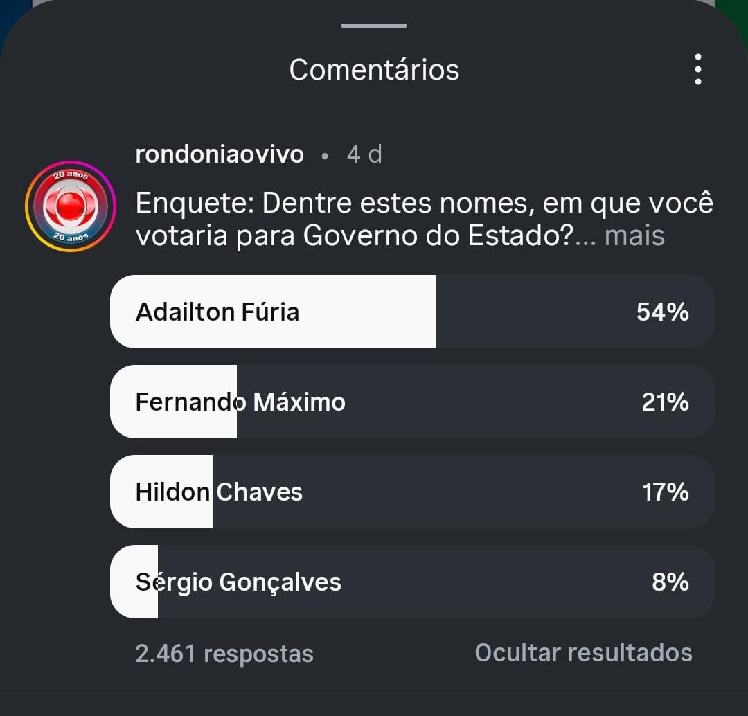 O levantamento foi feito na página do Instagram do Rondoniaovivo e 2.461 pessoas responderam. Uma informação interessante, na postagem da rede social também houveram 521 comentários e 192 compartilhamentos. Depois de quatro dias no ar e com largo alcance da enquete entre internautas, Adailton Fúria ficou em primeiro lugar, com bastante folga percentual.