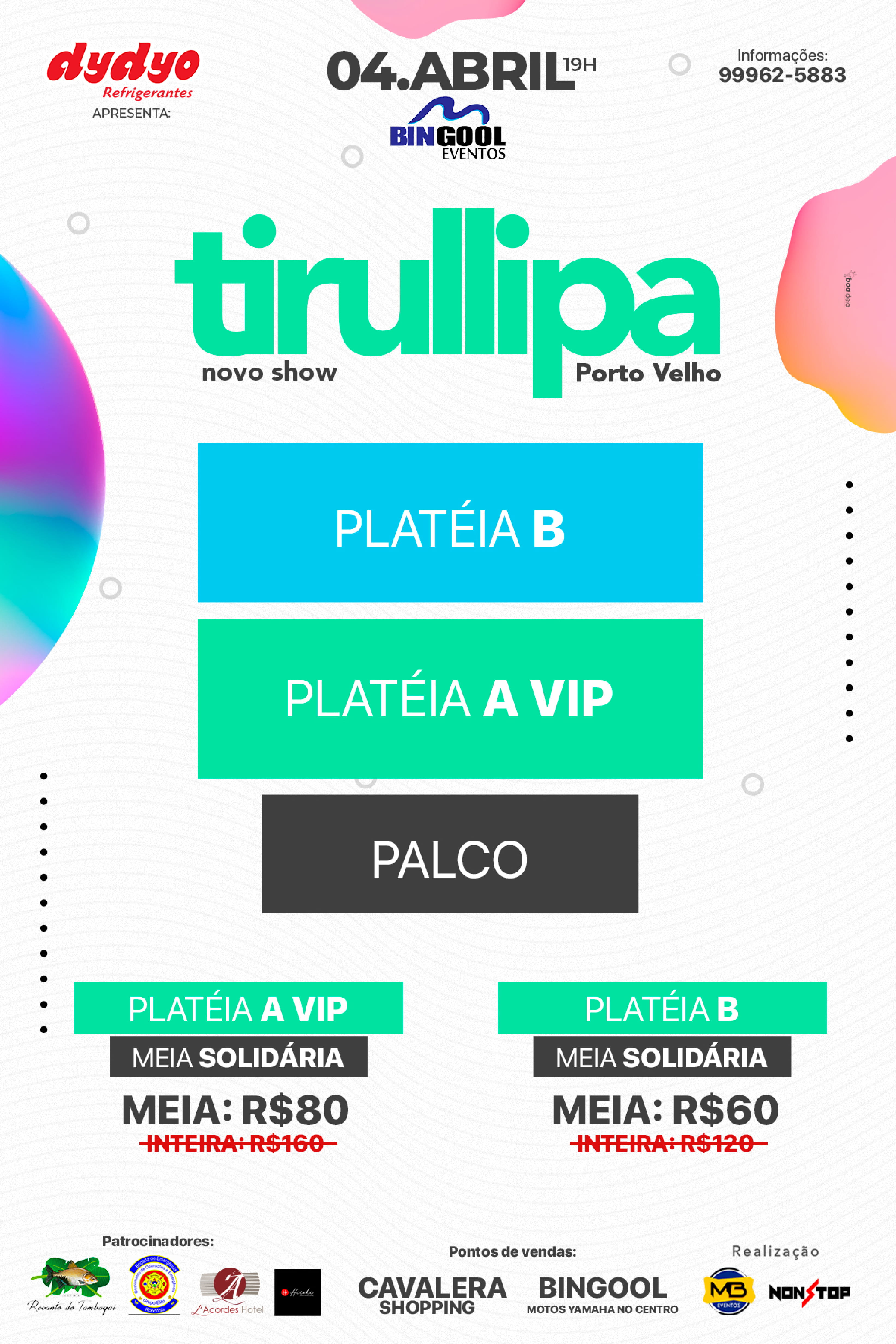 Alô galera! Tirullipa, humorista e rei das paródias está de volta em Porto Velho com mais um sucesso “Se você não riu, vai achar graça”. É dia 04 de abril, a partir das 19:00 no Bingool Eventos.